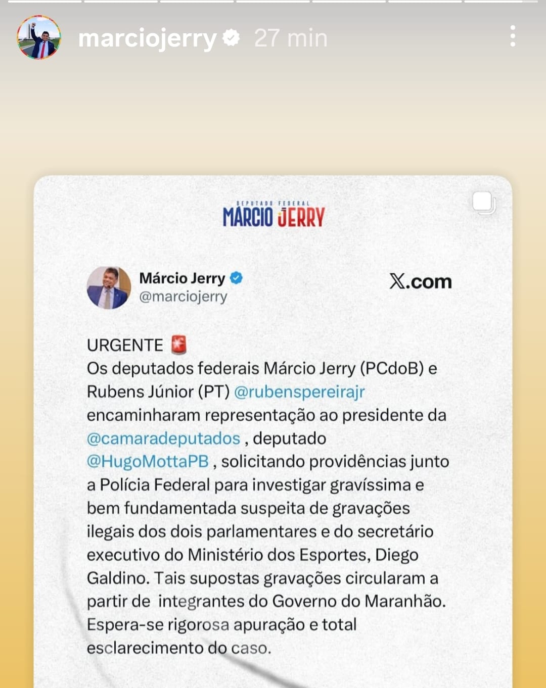 Usando seu perfil no Instagran o parlamentar comunista disse que ele e o deputado Rubens pereira Jr(PT) e o assessor de assuntos aleatórios Diego Galdino estariam sendo monitorados através de gravações.