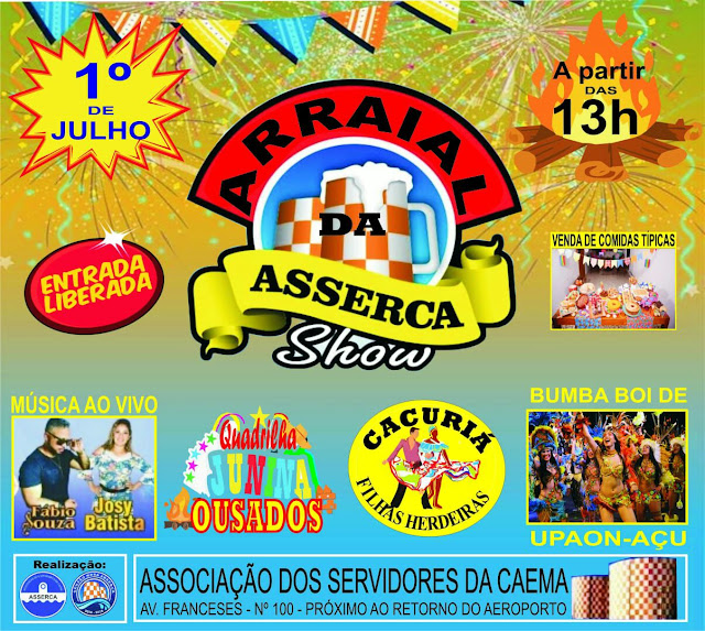 A associação dos servidores da CAEMA, realiza, neste domingo (01), a partir das 13h, o arraial a todos os servidores que fazem parte do órgão. A programação, que promete abrilhantar a noite conta com a bela apresentação do Boi de Upaon Açu e de diversas manifestações culturais.