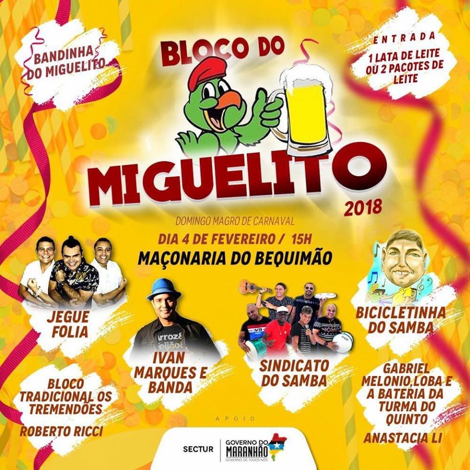 O Bloco do Miguelito, animada brincadeira originária no Angelim, que hoje se consolida como uma das manifestações mais tradicionais e ordeiras do pré-Carnaval, em São Luís, firmou parceria cidadã com o Centro de Hamatologia e Hemoterapia do Maranhão (Hemomar). Foliões interessados em participar do bloco poderão, além da doação de leite em pó, apresentar um comprovante de doação de sangue do ano de 2018 para ter acesso à brincadeira, que acontecerá dia 4 de fevereiro, na sede da Maçonaria, no conjunto Bequimão.