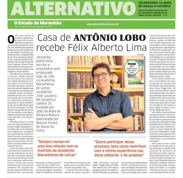 Félix Alberto Lima foi eleito em 21 de junho, mas não teve concorrentes. “Sempre conservei uma boa relação com os imortais da Academia Maranhense de Letras e, agora, essa convivência ficará ainda mais intensa, sendo isto para mim motivo de orgulho, dada a importância da instituição para a sociedade. Assumo uma responsabilidade grande, pois sucedo a José Louzeiro, que é uma referência na literatura maranhense e, mais ainda, no cinema brasileiro”, diz ele, que é também diretor-geral da Clara Comunicação e da Clara Editora, esta segunda com mais de 40 livros editados, sendo alguns, biografias de intelectuais que passaram pela AML, entre edições e reedições.