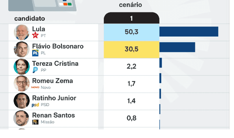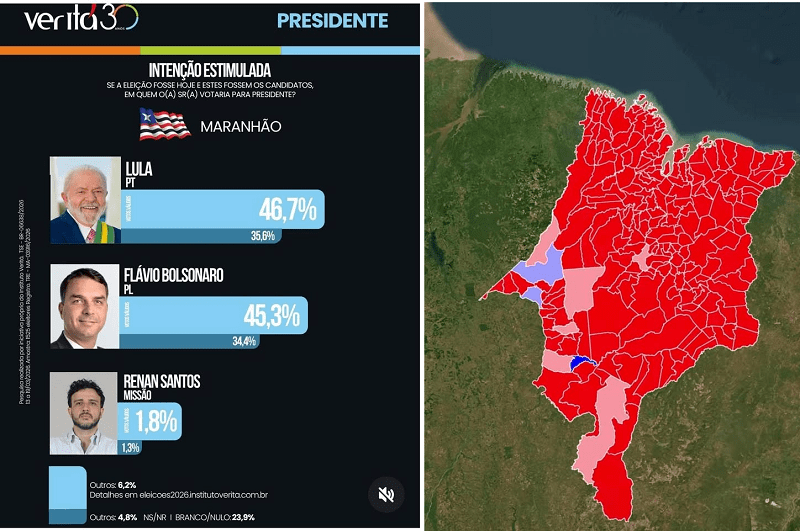 Dados de institutos consolidados mostram um cenário completamente diferente. Levantamento da Paraná Pesquisas, por exemplo, indica Lula com mais de 50% das intenções de voto no Maranhão, contra cerca de 30% de Flávio Bolsonaro, uma vantagem de quase 20 pontos percentuais.