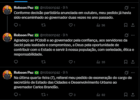Na esteira do desembarque de Rubens, também deixou o Executivo o jornalista Robson Paz, que havia sido indicado pelo PCdoB para a Secretaria de Cidades. O comunista também divulgou uma carta nas redes sociais.